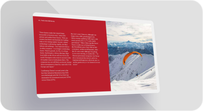 10 | PwC’s 21st CEO Survey “Three factors make the United States But don’t count China out. Although it no favourable to business now,” notes CEO longer rides a 10% growth juggernaut, advisor and author Ram Charan. “First, no China remains a global growth engine with country has better mechanisms for funding steady growth of 6.5 to 7% and a stable risks or for raising capital. Second, robotic government.5 Where China lags the United technology is advancing rapidly, and thus States is in the ease of doing business – labour cost arbitrage – less expensive labour the World Bank ranks China 78th (of 190 in other countries – is no longer a restricting economies) on this overall measure, while factor. Third is growth. At 3%, it is a huge the US ranks sixth (although Hong Kong factor. And despite a labour shortage, high- is even more inviting, at number five). The level skills in the US are still the best in the Chinese government recognises that foreign world. Foreigners who want to succeed in the direct investment has slowed, and it has US market want to build plants there. The implemented important reforms to open its corporate tax cut will likely accelerate foreign market, particularly in the financial services direct investment in America, especially from sector.6 Europe and Japan.” Confirming Charan’s second point is the fact that Industrial Manufacturing CEOs overwhelmingly pick the US as their top destination for investment next year (43%) versus China (27%).