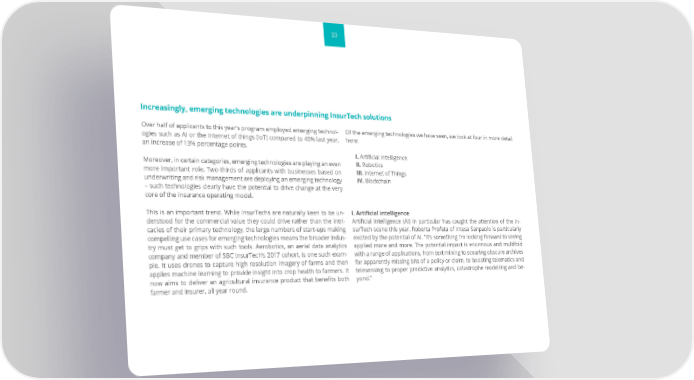 23 Increasingly, emerging technologies are underpinning InsurTech solutions Over half of applicants to this year’s program employed emerging technol- Of the emerging technologies we have seen, we look at four in more detail ogies such as AI or the internet of things (IoT) compared to 40% last year, here: an increase of 13% percentage points. I. Artificial intelligence Moreover, in certain categories, emerging technologies are playing an even II. Robotics more important role. Two-thirds of applicants with businesses based on III. Internet of Things underwriting and risk management are deploying an emerging technology IV. Blockchain – such technologies clearly have the potential to drive change at the very core of the insurance operating model. This is an important trend. While InsurTechs are naturally keen to be un- I. Artificial intelligence derstood for the commercial value they could drive rather than the intri- Artificial intelligence (AI) in particular has caught the attention of the In- cacies of their primary technology, the large numbers of start-ups making surTech scene this year. Roberta Profeta of Intesa Sanpaolo is particularly compelling use cases for emerging technologies means the broader indus- excited by the potential of AI. “It’s something I’m looking forward to seeing try must get to grips with such tools. Aerobotics, an aerial data analytics applied more and more. The potential impact is enormous and multifold company and member of SBC InsurTech’s 2017 cohort, is one such exam- with a range of applications, from text mining to scouring obscure archives ple. It uses drones to capture high resolution imagery of farms and then for apparently missing bits of a policy or claim, to boosting telematics and applies machine learning to provide insight into crop health to farmers. It telesensing to proper predictive analytics, catastrophe modelling and be- now aims to deliver an agricultural insurance product that benefits both yond.” farmer and insurer, all year round.