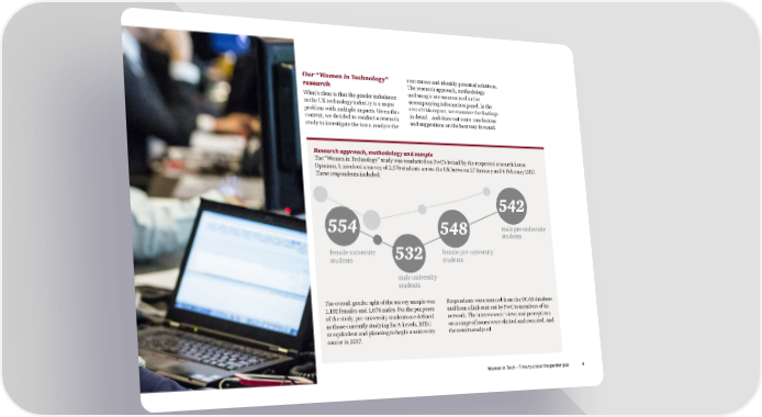 Our “Women in Technology” root causes and identify potential solutions. research The research approach, methodology What’s clear is that the gender imbalance and sample are summarised in the in the UK technology industry is a major accompanying information panel. In the problem with multiple impacts. Given this rest of this report, we examine the findings context, we decided to conduct a research in detail – and draw out some conclusions study to investigate the issue, analyse the and suggestions on the best way forward. Research approach, methodology and sample The “Women in Technology” study was conducted on PwC’s behalf by the respected research house Opinium. It involved a survey of 2,176 students across the UK between 27 January and 6 February 2017. These respondents included: 542 554 548 male pre-university students female university 532 female pre-university students students male university students The overall gender split of the survey sample was Respondents were sourced from the UCAS database 1,102 females and 1,074 males. For the purposes and from a link sent out by PwC to members of its of the study, pre-university students are defined network. The interviewees’ views and perceptions as those currently studying for A-Levels, BTEC on a range of issues were elicited and recorded, and or equivalent and planning to begin a university the results analysed. course in 2017. Women in Tech – Time to close the gender gap 4